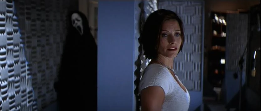 Hide and Seek Gale hides from Ghostface in Scream 2.