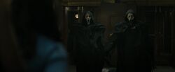 At the theatre, Kirby is wandering around (off-screen) and is ambushed by two Ghostface killers. One of those killers then attacks Tara, Sam and Chad and when Chad tries to hold the killer back to allow Sam and Tara to escape, the second Ghostface emerges, and they take turns stabbing Chad over and leaving him for dead. The two killers wipe the blood off their knives in sync and follow the sisters into the theatre where they prepare to fight. At that same time, Kirby regains consciousness and returns to the theatre hall, however, Sam and Tara are distrusting of her as Wayne told them that she was expelled from the FBI for mental health reasons. At that same time, Wayne arrives and shoots Kirby, revealing himself as one of the killers.